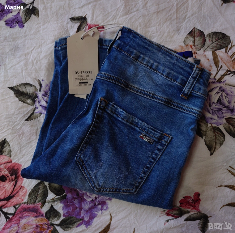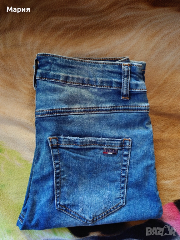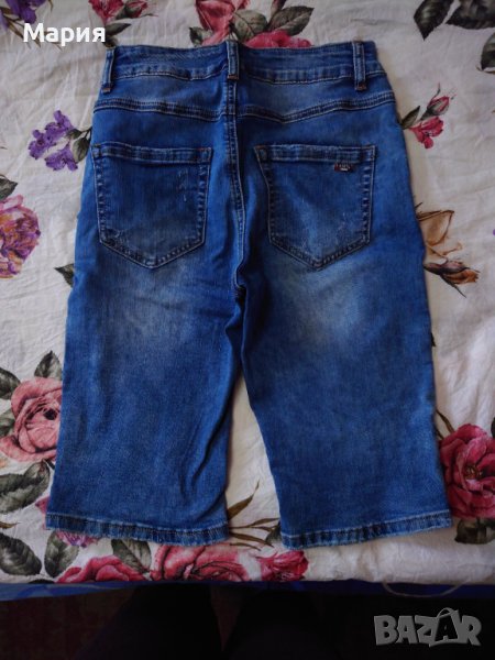 Дамски дънкови бермуди, размер 25, с висока талия и протрит ефект на плата.