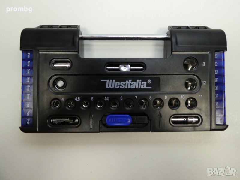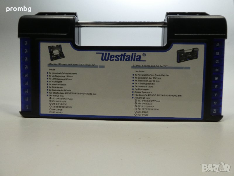 Оригинален комплект инструменти Westfalia – висококачествен сет от 57 части, включващ вложки, битове и тресчотка, подредени в удобен и здрав куфар с дръжка.. Съдържание: