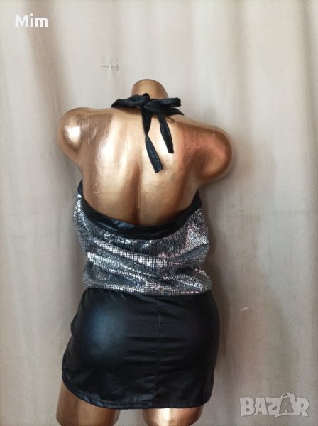 Черна къса рокля със сребристи пайети ,полата е еко кожа в ханша 40 до 45 см едностранно , завързва се през вратът. Неразличима от нова без хартиен носител.