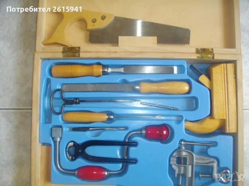 Цена на нов дърводелски комплект мини ръчни инструменти 15 части за моделизъм - немско старо качество , в дървен куфар - 299 лв.(152.88 €)