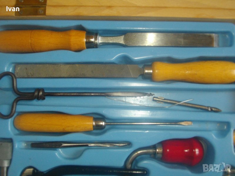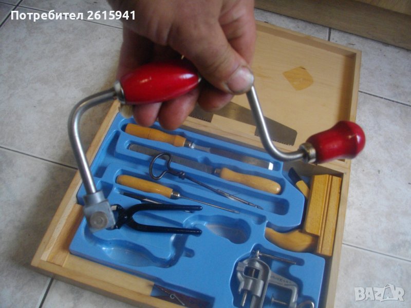 ОПИСАНИЕ на нов комплект мини ръчни инструменти 15 бр. за моделизъм. Цена 299 лв. (152.88 €)Съвсем нов, неизоплзван и неупотребяван. Немско сатро висококачествено произовдство. Маркировки GERMANY / STAHL.Комплектът е прибран в оригинален дървен чуков куфар/кутия с метални копчалки. Размери на куфара - 360 х 260 х 60 мм. Кутията е с вложка от ПВЦ дебела. Вградени места от двете страни на кутията за компонентите. Мини ренде дърводелско с нож размер 25 мм ширина. Размери на рендето - 120 х 90 х 35 мм.Менгеме мини алуминиево с маркировка GERMANY и метална стяга на него. Клещи масивни мини резачки STAHL.Маткап ръчна дрелка мини за бургии и свредла. Дълга тънка права отвертка с дървена букова дръжка. Ръчене метален дълъг свредел за отвори. 2 бургии дърводелски с канали за маткапа. Парче тънка стоманена тел жица, щипка за защипване, пила с дървена дръжка двестранна - дърво8метал. Длето ръчно дърводелско за стружуване с букова дръжка.Трион дърводелски мини с букова дръжка. Прав ъгъл буков дървен.