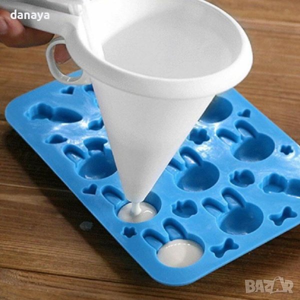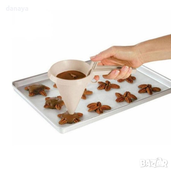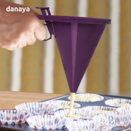 Кухненска фуния, специално проектирана за пълнене на формички за мъфини с кексова смес, без да разливате ненужен материал. С фунията лесно може да поставите глазура върху сладките, да украсите торти, кекс, или други сладкиши.