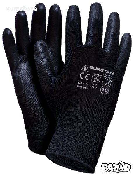 Защитни ръкавици от полиестерна прежда, покрита с полиуретан, черен цвят.