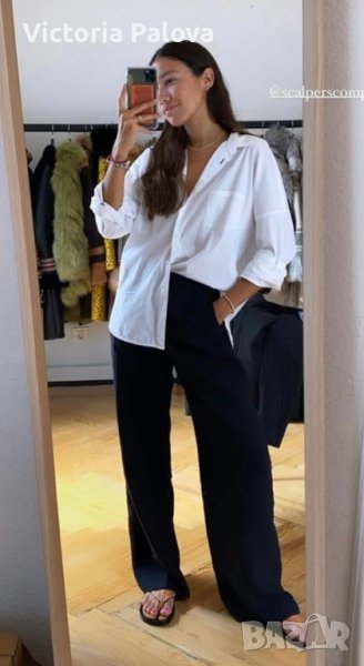 Неупотребяван лек панталон, гладък памук.Красива кройка,джобове.Талия - 46см, дължина - 103см, отвътре - 76см. Крачолът горе е 34см широк, долу - 19см, дълбочина - 40см.Панталонът е много подходящ както за широки овърсайзни блузи и туники, така и за класически ризи.