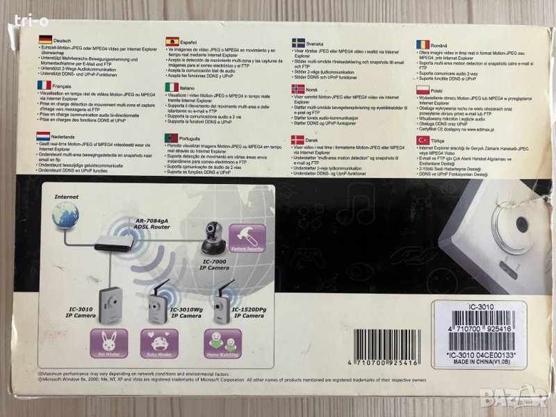 Edimax IC-3010 е Fast Ethernet мрежова камера, пригодена за поточно видео на живо през вашата мрежа. Видеото може да се гледа навсякъде от вашите локални компютри и дори през интернет. Тази камера се предлага и с безплатен софтуер, който ви позволява да преглеждате до 16 изображения от камерата едновременно.