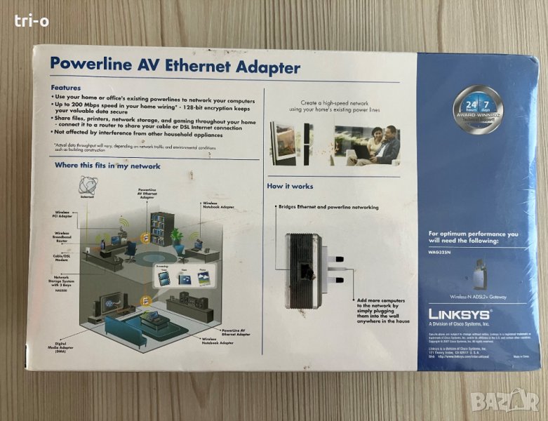 PowerLine AV Ethernet адаптерът ви позволява да превърнете съществуващите електропроводи във вашия дом или офис във високоскоростна мрежа. Сега не е нужно да пробивате стените и да се катерите през тавана или мазето, за да инсталирате мрежови кабели - просто използвайте кабелите, които вече минават през сградата! PowerLine AV адаптерът свързва Ethernet устройства към мрежовия стандарт HomePlug AV PowerLine. Просто включете PowerLine AV адаптера в стената и свържете вашето оборудвано с Ethernet устройство към адаптера с помощта на включения мрежов кабел и ще превърнете цялата си къща в мрежова инфраструктура! Свържете повече компютри към мрежата, като просто ги включите в стената навсякъде в къщата, като използвате повече PowerLine AV адаптери.