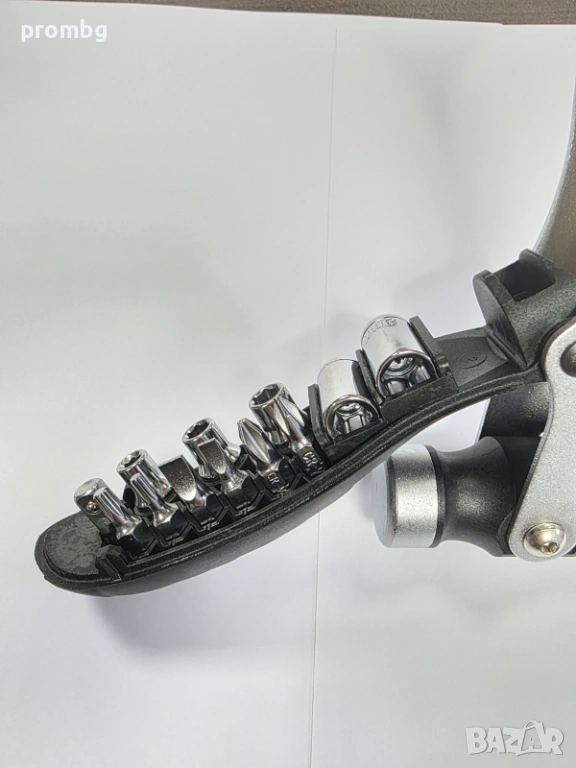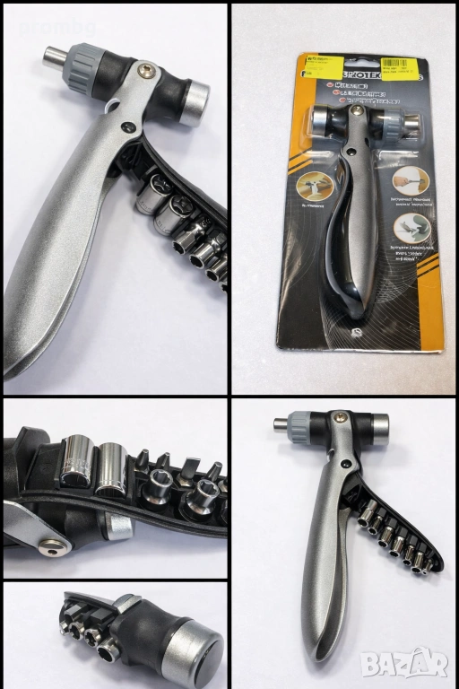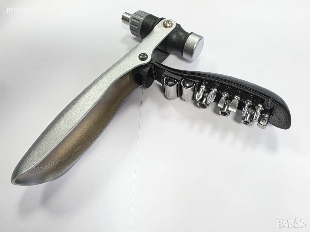 Практичен и компактен мултифункционален инструмент, който съчетава чук, тресчоткова отвертка и гедоре (socket wrench) в едно удобно тяло. Подходящ е както за домашна употреба, така и за сервизни дейности, монтажи и ремонти.