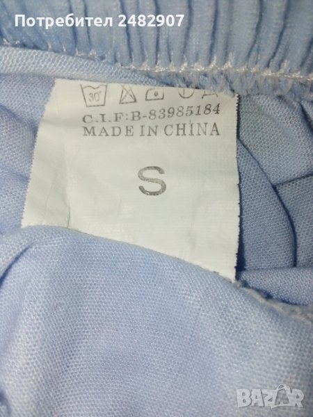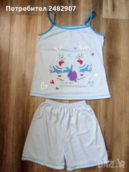 Светло син дамски комплект - потник с регулируеми презрамки и къси панталони, размер S. Съдържа 85 % памук и 15 % полиестер. Ширина под мишниците - 43 см, ширина в долната част - 50 см, дължина от горната част на презрамката до долу - 58 см. Много запазен, почти не е използван, без забележки.