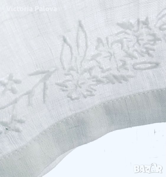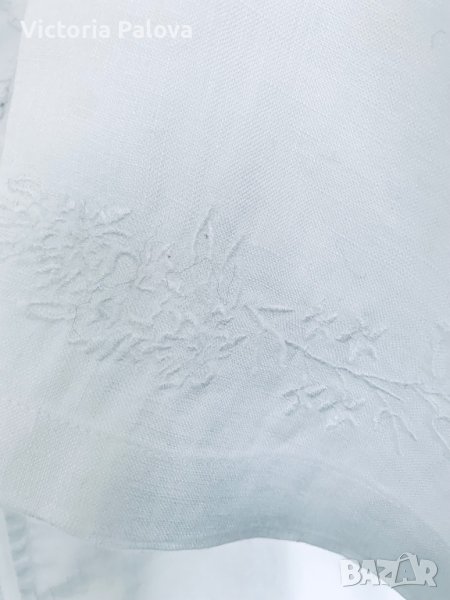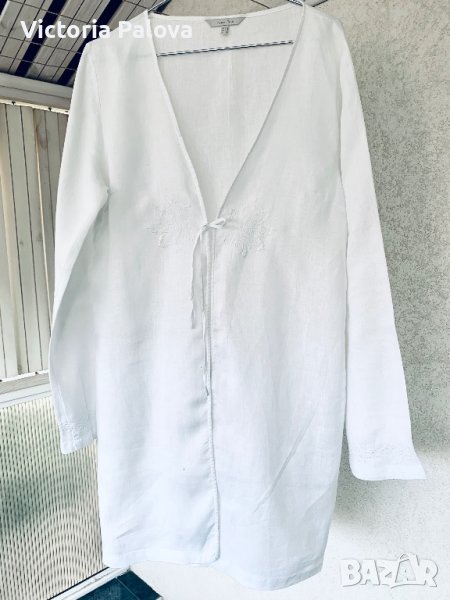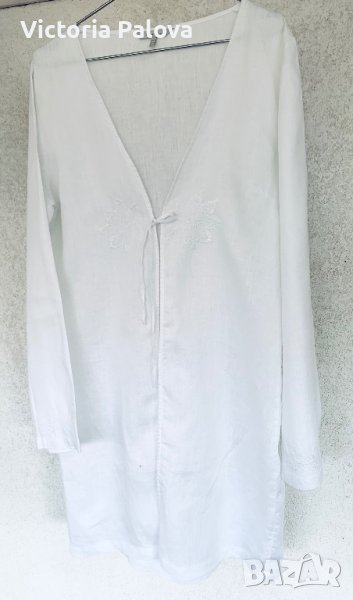 Тънък гладък дишащ лен, нежни бродерии отпред и по ръкави, много красива туника, подходяща и за море. Рамо - 44см, ГО - 52см, дължина - 93см, ръкав - 64см.