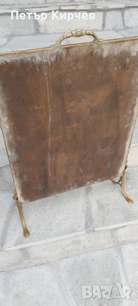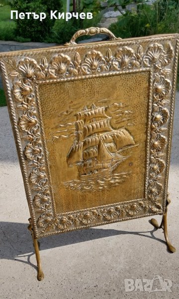Старинен параван/предпазител за камина- изработка дърво с бронзов обков с изразена релефна сцена кораб-височина 70см-маркиран на гърба-Перфектен!