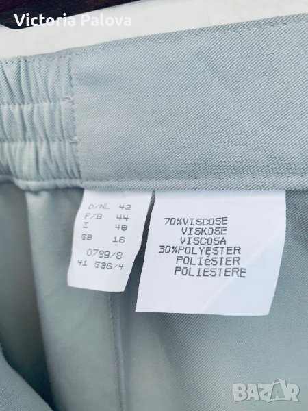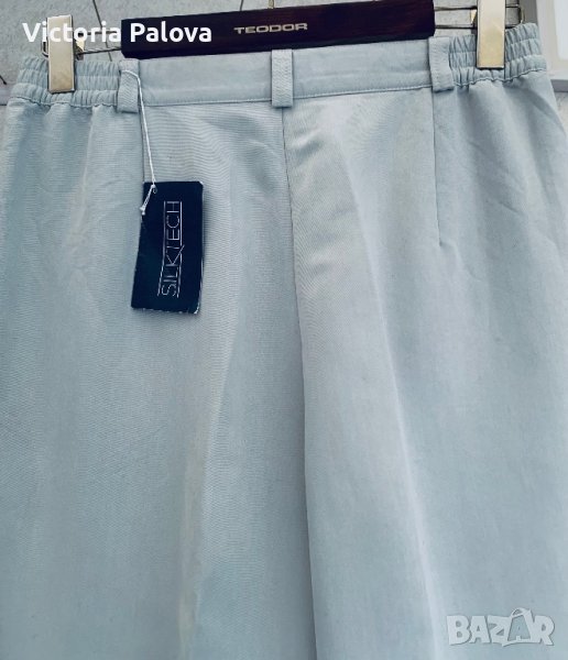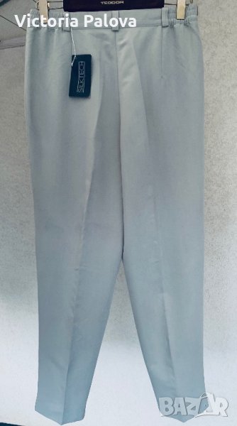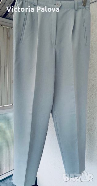 Невероятен рядък цвят - гълъбов, който се съчетава с всички цветове, но особено красиво с черен; материята е като коприна, хубава стилна комфортна кройка. Талия- 40см ( разтяга се до 44см), дължина - 103см, отвътре - 71см, крачол горе - 36см, долу- 18см, дълбочина - 45см, цепки на крачола - 3,5см.