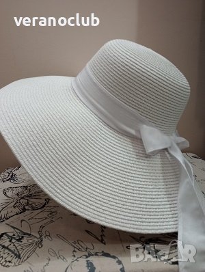 Бяла дамска лятна капела. Нежен дамски модел с бяла текстилна лента, завършена с панделка.