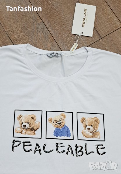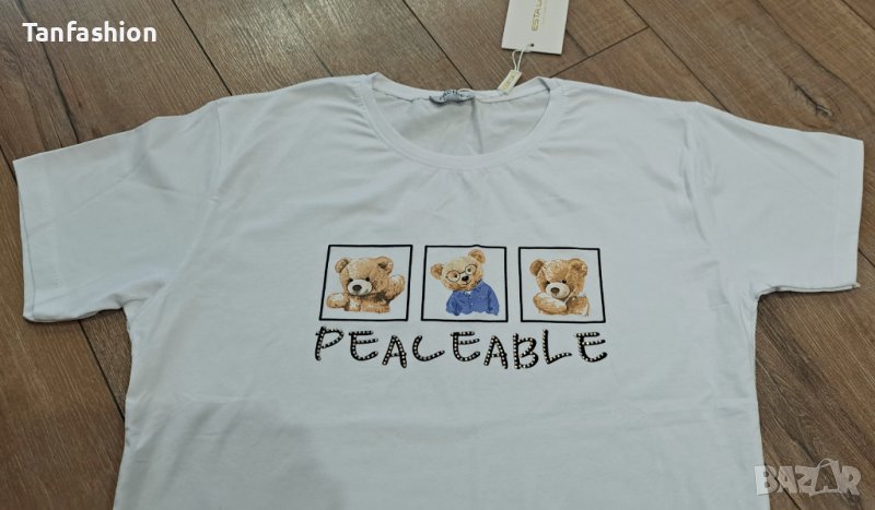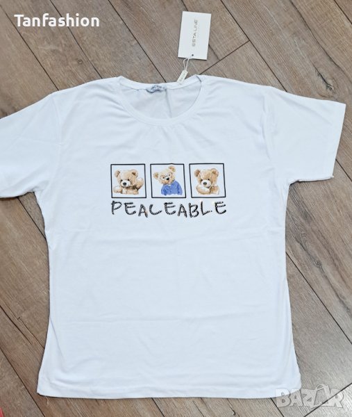 Нова дамска снежнобяла тениска с кокетна щампа мечета и декорация от нежни камъчета