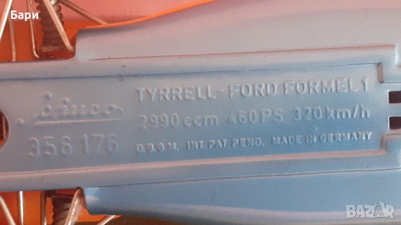 Формула 1Schuco Tyrrell-Ford 356176 Формула 1 за първи път влезе в гамата на "Schuco" през 1972 г. и се произвеждаше до около края на 70-те години. Има прост часовников механизъм за бързо движение напред, който може да се навива или чрез предоставения ключ за навиване, или чрез фрикционното колело, монтирано под автомобила. Посоката на движение може да се контролира чрез волана, а джантите, всяка снабдена с независимо окачване на колелата, могат лесно да се демонтират чрез централната ключалка, завинтена с крилчата гайка.