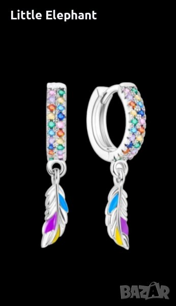 Дизайнерски модел сребърни висящи обеци Пандора халки с пера,колекция"Sensitivity",coloured/нови → Обява 41565191
