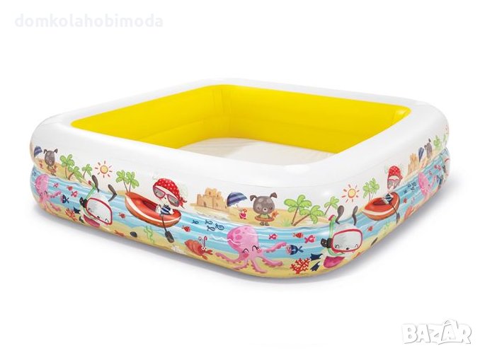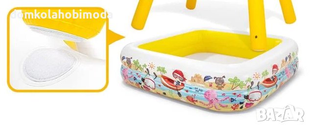 Детски басейн "Sun Shade" 157x157x122см - Intex Описание - Характеристики Детски басейн с издръжливо дъно и надуваеми странични стени за допълнителна здравина и комфорт. Има подвижен сенник за защита на вашето бебе. Включени лепенки за ремонт. Не поставяйте басейна върху цимент, асфалт или друга твърда повърхност. Подарете на децата безкрайна прохладна игра в разгара на лятото. *Капацитетът се отнася за запълване до 22см стени.