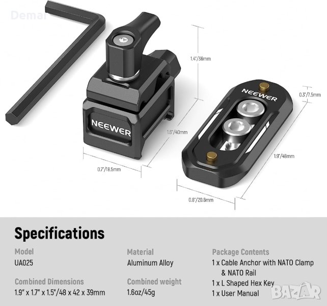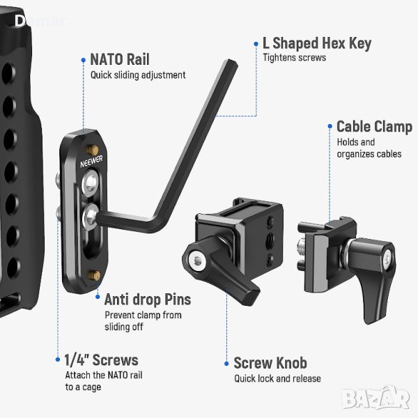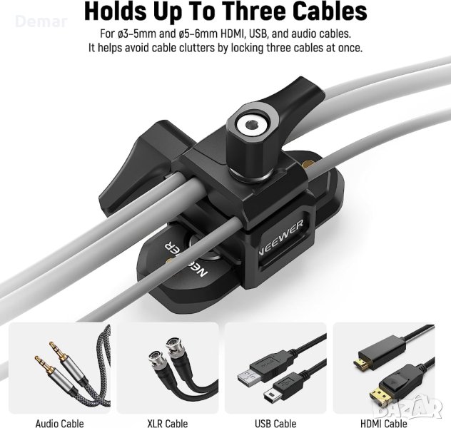 Гъвкава кабелна котва за HDMI, USB, DC и аудио кабели. Осигурява и организира три кабела с различни диаметри. Бързо освобождаваща се НАТО скоба със закрепващи щифтове против падане. Включва резервна 48 мм НАТО релса за лесен монтаж. Регулируемо позициониране върху НАТО релсата. Пакетът включва кабелна котва, НАТО скоба, НАТО релса, шестограмен ключ и ръководство за потребителя.