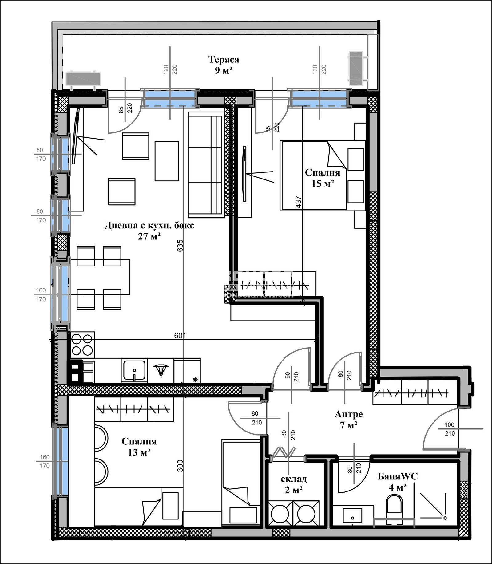 Разпределения - Предлагаме на Вашето внимание светли и функционални апартаменти. Жилището се състои от ъглова светла дневна 27кв.м. с трапезария и кухненски бокс с излаз на тераса, две самостоятелни спални: родителска 15кв.м., детска 13кв.м., баня с тоалетна, перално и входно антре с място за гардероб. Имате възможността да си закупите жилище с една, две или три спални!
