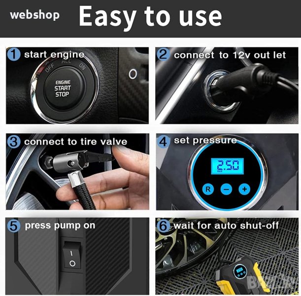 Операция е проста и улеснена. Включете захранването към запалката на колата, стартирайте автомобила. Двигателят на автомобила ще активира помпата, за да повиши мощността. Развийте капачката на винтила (клапана), свържете помпата и фиксирайте предварително на дисплея желаното от вас налягане в гумите. Поставете директно в клапана на гумата подходящата дюза. Стартирайте с копчето. Процеса е автоматичен и завършва с едно щракване, когато в гумата е достигнато необходимото зададено налягане. Тази малка помпа не се препоръчва за напомпване на големи и тежкотоварни автомобилни гуми. Помпата работи при налягане на въздуха не повече от 300 PSI.