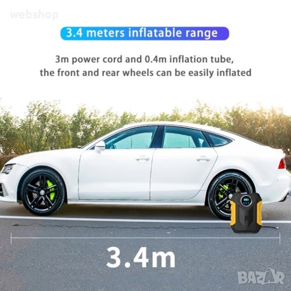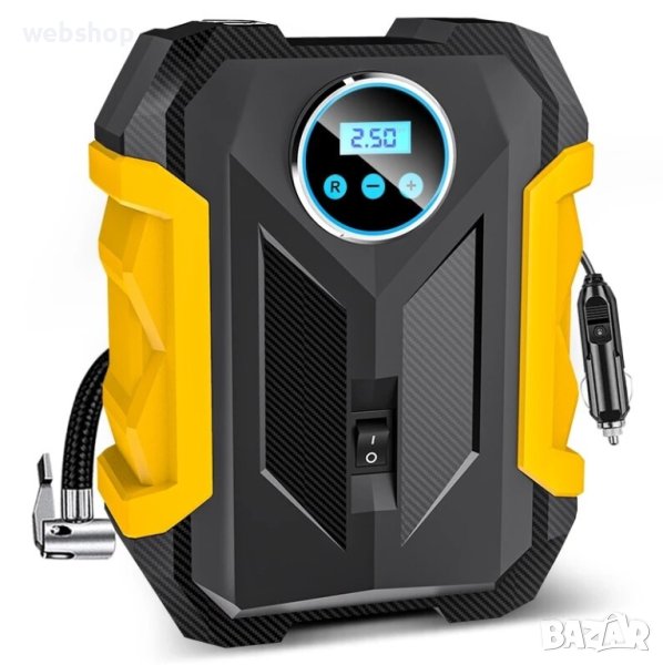 Автомобилна портативна въздушна помпа с безжичен цифров дисплей. Модел C1399, автоматична с предварително задаване на налягането. Електрическата портативна въздушна помпа C1399 е многофункционална, заради трите сменяеми накрайника. Подходяща е както за автомобилни гуми, така и за гумени лодки, детски басейни, велосипедни гуми, надуваеми матраци и кресла, топки и други. Изключително лесна и практична за употреба. Новото е цифровия дисплей, на който можете да задете исканото налягане, както и във всеки момент, екранчето ви показва достигнатото налягане. Помпата автоматично спира при достигане на предварително зададеното налягане.