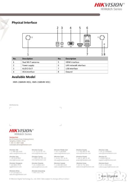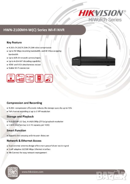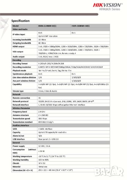 Hikvision 8-канален IP WI-FI NVR HWN-2108MH-W(C), серия Hiwatch, е усъвършенствано записващо устройство, предназначено да управлява и съхранява видео записи от до 8 IP канала. С резолюция на запис до 4MP, този NVR предлага ясни и детайлни изображения, за ефективно наблюдение на пространства. Поддържа множество резолюции, включително 4M, 3M, 1080p, 1.3M и 720p, което позволява гъвкавост според нуждите.