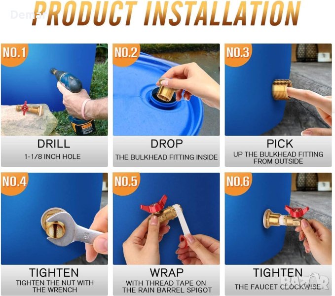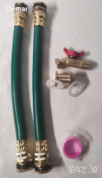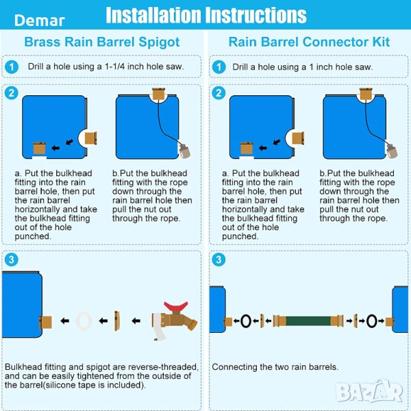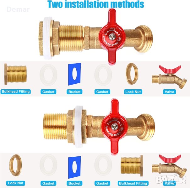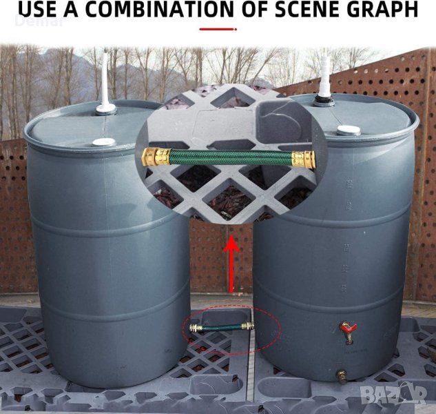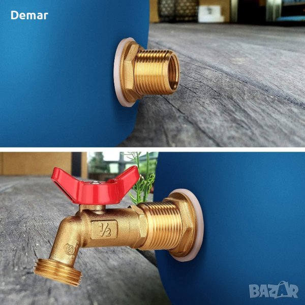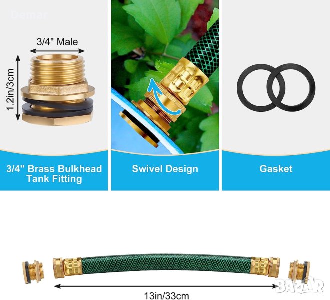 Комплектът месингов кран за дъждовна цев включва тежкотоварен 3,2 унции плътен месингов преграден фитинг (1,52 см), 1/2" женски до 3/4" мъжки конектор за преграда на резервоар за вода (1,27 см) и 3/4" солиден месингов сферичен кран за изход за вода (1,27 см). Комплектът включва също две бели шайби, два 13-инчови 3/4" градински маркуча (33 см), четири 3/4" мъжки месингови фитинги за преграда, осем черни шайби и уплътнителна лента за резба.Този изчерпателен пакет осигурява всички необходими компоненти за лесен монтаж и свързване на