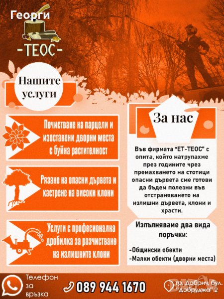 Кастрене и рязане на опасни дървета, косене на тревни площи и разчистване на буренясали места и вили.