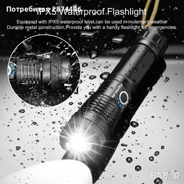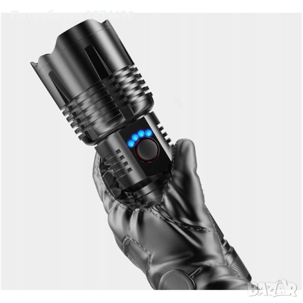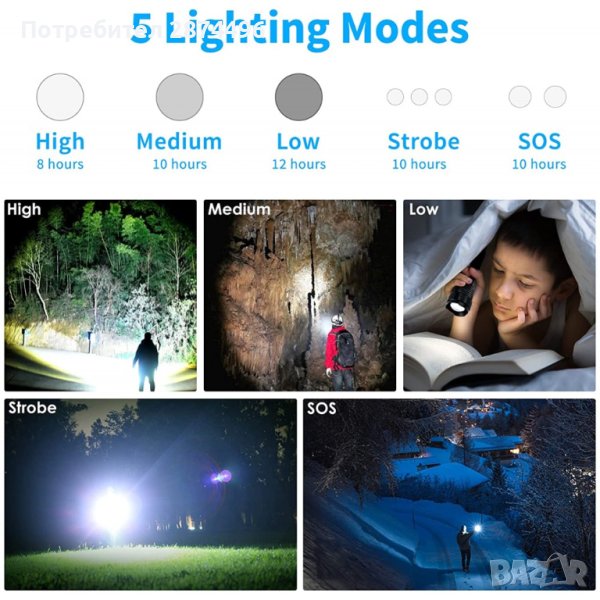 5 режима на работа с един бутон: силна светлина, средна светлина, слаба осветеност, стробоскоп и SOS светлина;