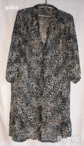Дълга риза от шифон с 3/4 ръкав. Дължина 88 см. Подмишници 57 см. Ханш 64 см. На етикета пише S размер, но е по скоро M, L. В отлично състояние.