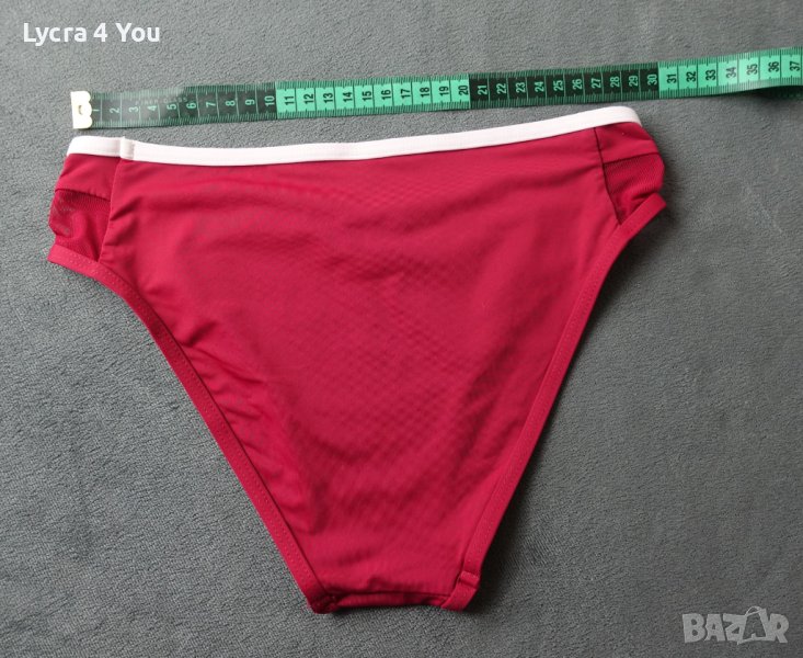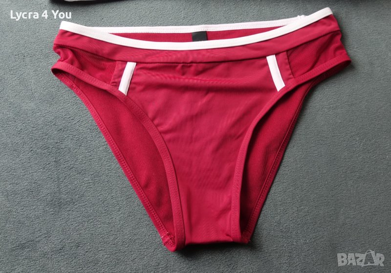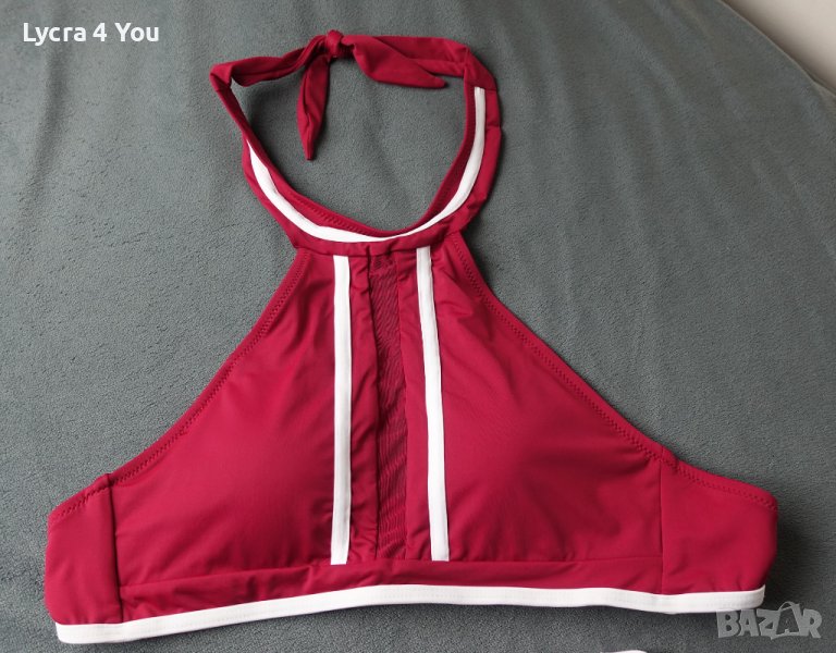 Нов бански комплект от бикина и бюстие/сутиен с завързване зад гърба и шията, което му позволява да стане както за 70-75В размер така и за 80В. Бикината е със стегнат хубав ластик и отговаря на S размер (талия 28см. с разтягане до 34см.) Долнището става и за XS и S размер.