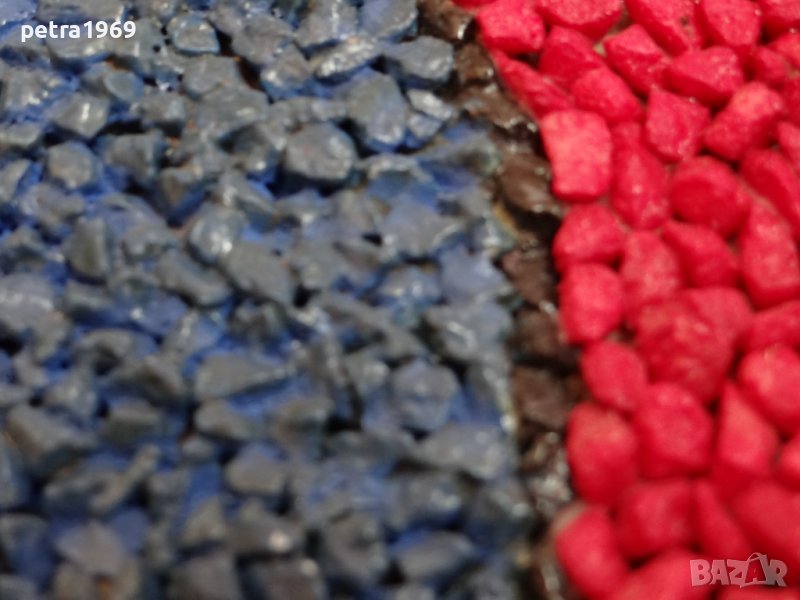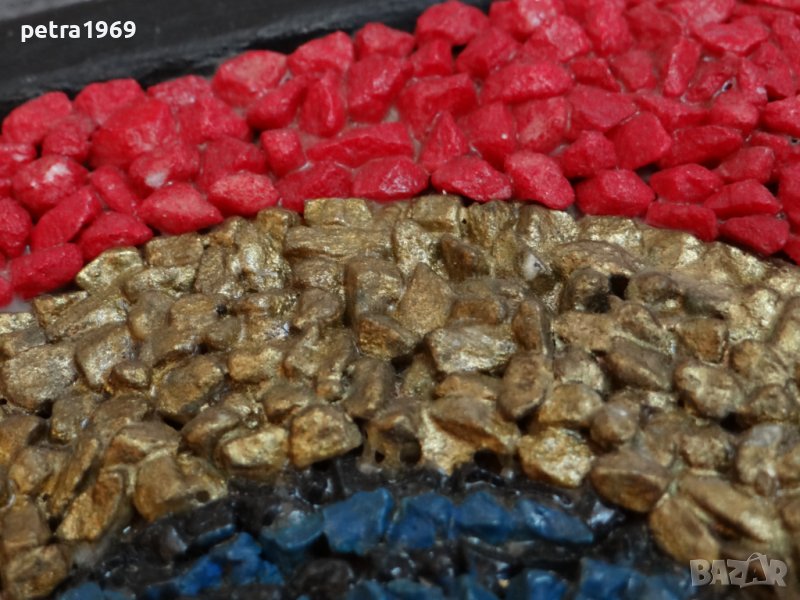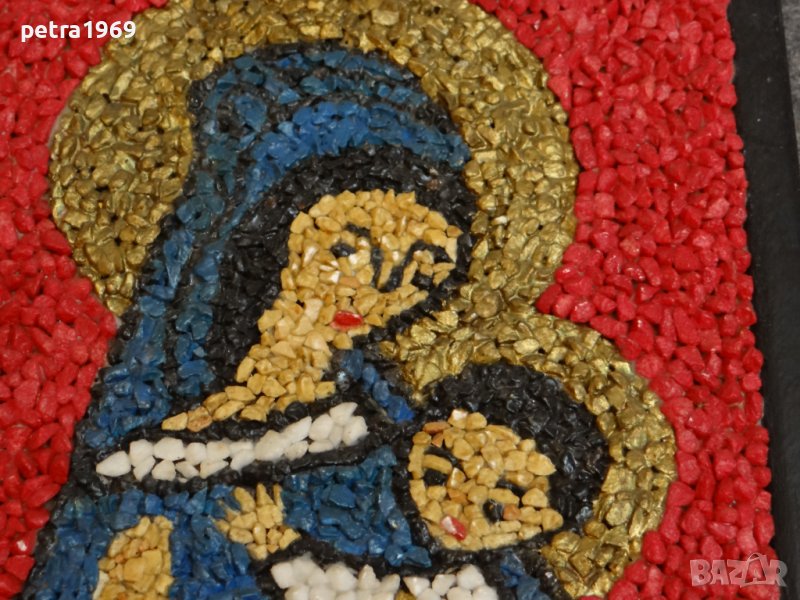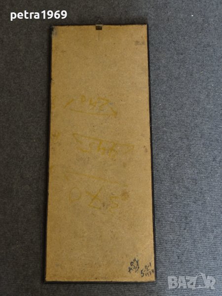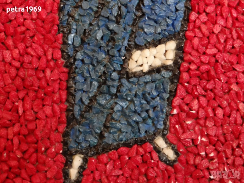Пано за стена, изработено от мозайка, подредена е фигурата, оцветена е, после е запълнена с цветен фон, ако се вгледате, ще забележите границите на изображенията. На гърба има инициалите на твореца и цифри, според мен си е датата 21 май 1974 г. Почти 50 годишна, запазила се в перфектно състояние, без избледнявания, без олющвания, без липсващи камъчета. Размерите с рамката са 54х20,5 см., дебелината е 1,2 см. Цена - 40 лв.