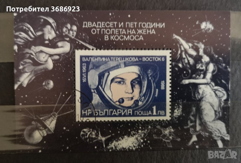 1988 (16 юни). 25 г. от полета на жена в Космоса. Блок с печат. → Обява 41587780