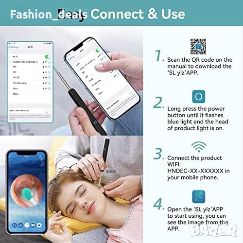 Комплектът включва: Ear Wax Removal Kit, 6 силиконови лъжички, 8 инструмента за почистване, Type C кабел, ръководство и чанта за съхранение.