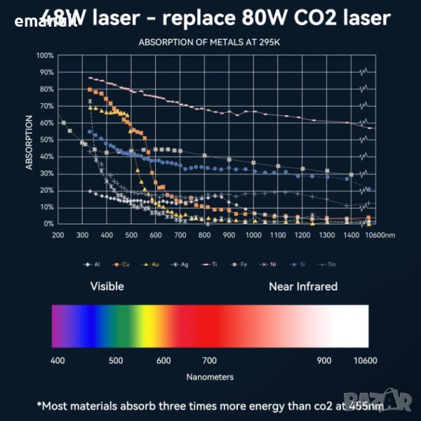 СИН-BLUE 450nm подходящ за рязане/гравиране всякаква дървесина,гравиране черна и неръждаема стомана,рязане/гравиране кожа,гравиране естествен-изкуствен камък и техни разновидности,рязане на всякакви пластмаси и гравиране предимно на двуцветни,гравиране на прозрачно стъкло с потъмняване или със специално цветно фолио за не метални повърхности и др.