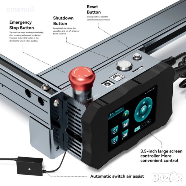 Контролери които могат управляват до 50W лазерен модул,автоматично управление на компресор Air assist през LightBurn,могат да управляват CNC рутер - Лазерна машина със смяна на Firmware,могат да работят с драйвери които се монтират на контролера или с външни драйвери за по-мощни стъпкови мотори NEMA.