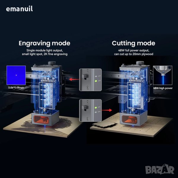 С ключе на самия лазерен модул се превключва за 24W гравиране по-концентриран лъч и 48W рязане на максимална мощност.