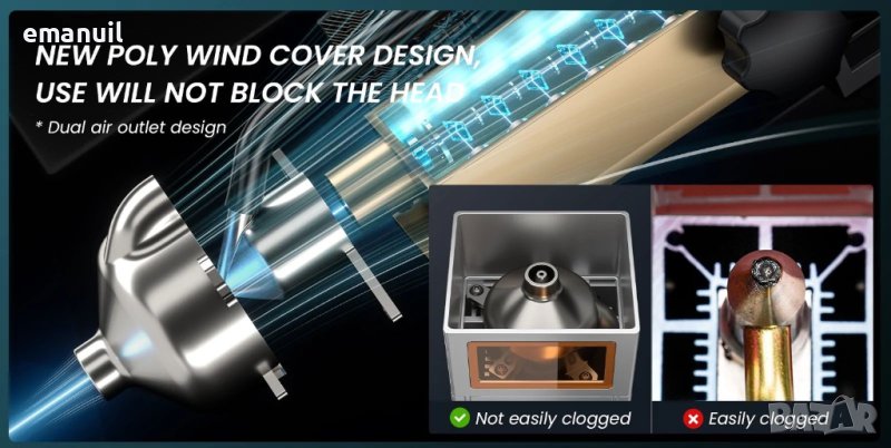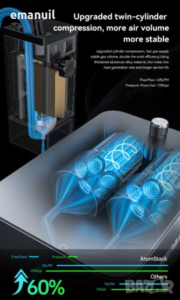 Компресор с две помпи за максимално налягане,двуканална дюза почистваща отвора за лазерния лъч което не позволява затапване-натрупване прах от самата работа.