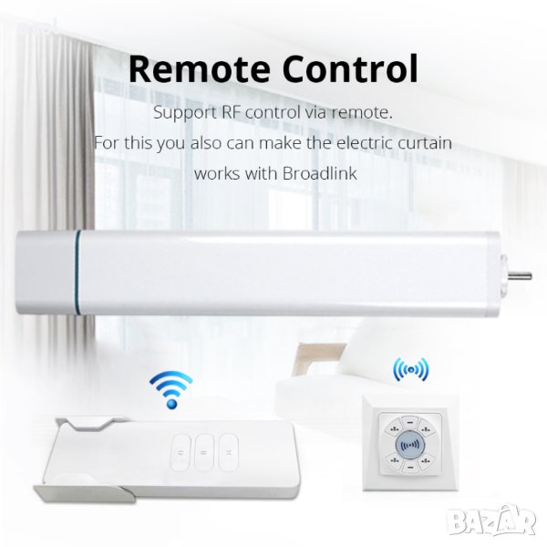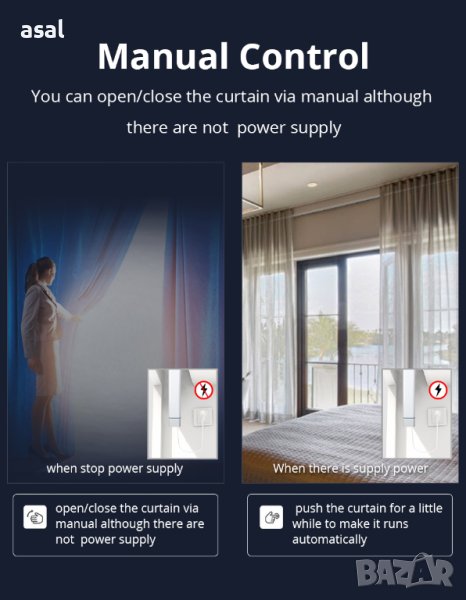 - Контролира се и ръчно, чрез леко дръпване на завесата в съответната посока, релсата автоматично се задейства и я прибира или разпъва напълно.