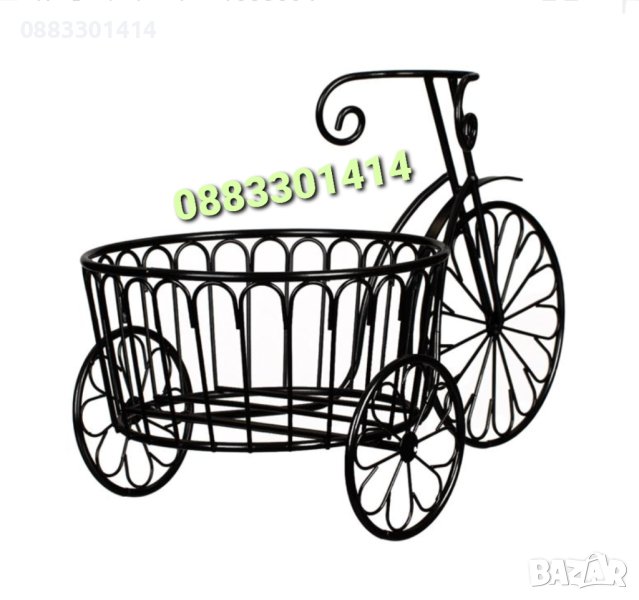 Поставка за саксия във формата на велосипед, изработена от метална сплав в черен цвят. Стилен и красив дизайн, който внася свежест и романтика в интериора.