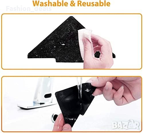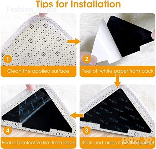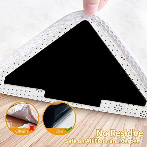 Надеждно фиксиране с триъгълен дизайн и силно лепило Предотвратява къдрене и плъзгане на килимите Не оставя следи при премахване Лесен за монтаж и демонтаж Подходящи за различни подови настилки: плочки, дърво, ламиниран паркет, мрамор, бетон, гума