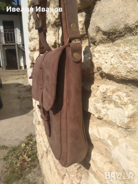 Ръчна изработка от естествена кожа 2,8мм, с размери В- 0,30 см.Ш-0,26см. на-0,06см. Външен и вътрешни джобове с цип и без цип Размери на по-голямата чанта са В. -0,26см. Ш.- 0,36см. на-0,08см.,подходящи и за лаптоп