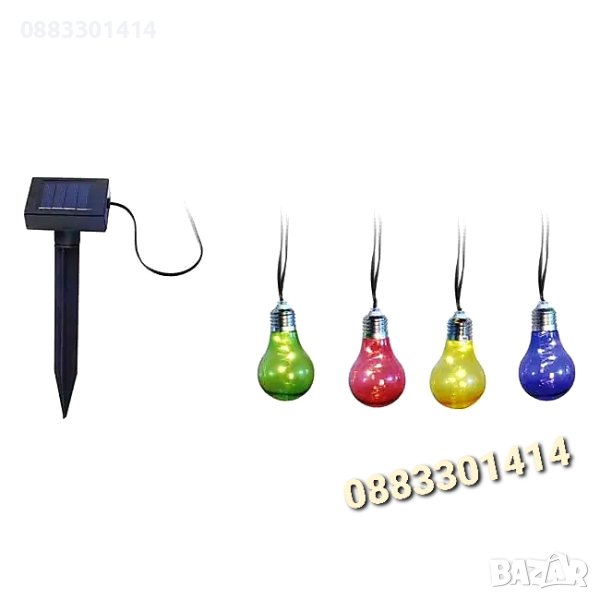 Соларен гирлянд с пластмасови цветни крушки, захранвани от слънчева светлина, без кабел и екологични. Съдържа акумулаторна батерия. Има бутон за включване/изключване.