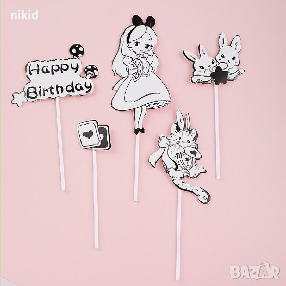 Алиса в страната на чудесата черно бял Happy Birthday сет топери клечки декор за торта украса парти → Обява 41602938