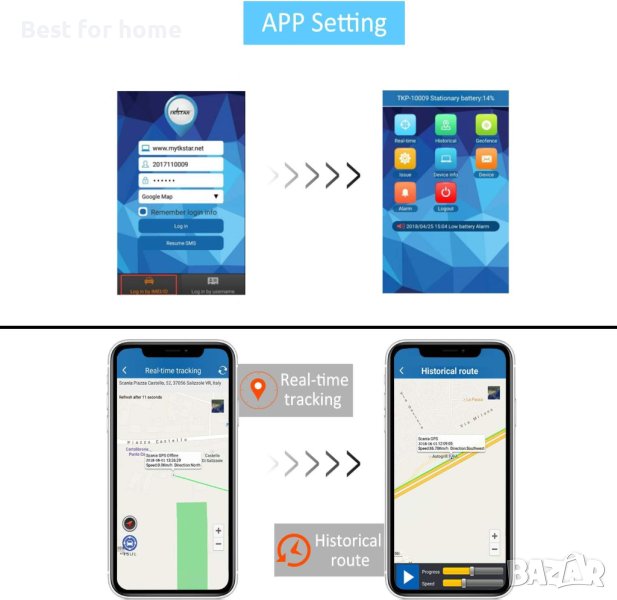 ★ Различни аларми за Geofence: различни аларми могат да бъдат зададени чрез APP или уеб, аларма за влизане или напускане на зоната, аларма за изтощена батерия, аларма за вибрация и т.н. При задействане ще бъде изпратено напомняне чрез SMS или приложение.