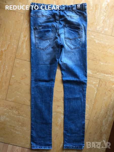 Запазени дънки, обувани няколко пъти. С пет джоба и гайки за колан. Закопчаване с цип и копче. Имат допълнителен ластик за корекция в талията. Изработени от леко еластична тъкан. Подходящи за деца на 12 -13 години.