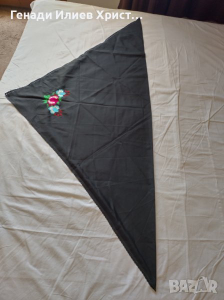 2. Черна кърпа за глава с цветна бродерия. Неизползвана. Отлично запазена. Закупувана е през 80-те години на миналия век от Триполи, Либия. Тънкия плат е прегънат на две и така е обработен по краищата и за бродерията.