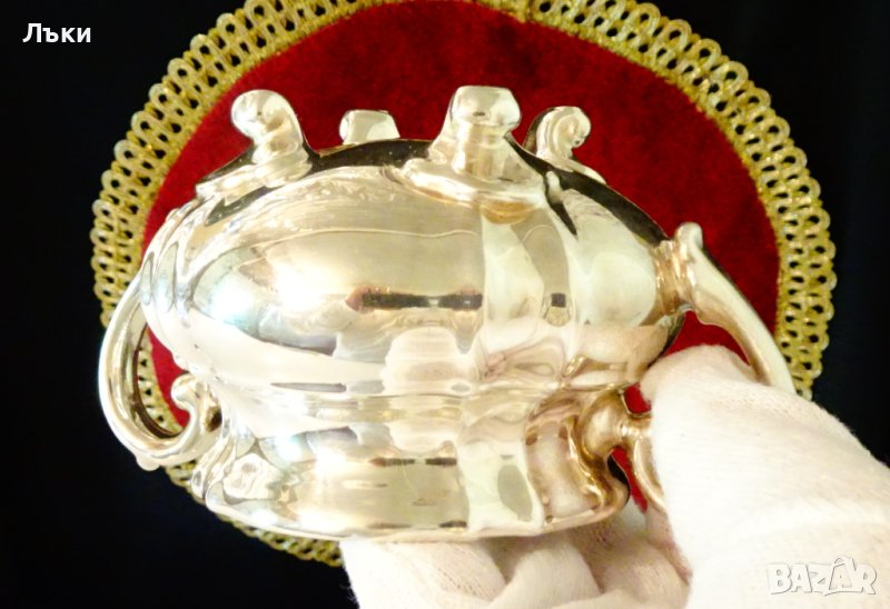 елегантно на четири извити барокови крачета.Височина 11 см.,дължина с дръжките