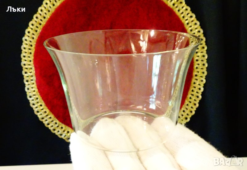 стъкло с подстакани,изработени от месинг,дебело посребрени с висока проба сребро.Декорирани с нежен ажур.Височина 6 см.,диаметър 8.5 см.,вместимост 160 мл.
