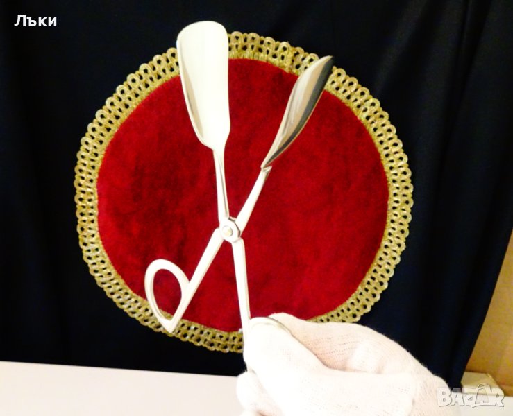 Старинна немска щипка за сервиране Alpaka дебело посребрена с 90 микрона висока проба сребро,маркирана.Дължина 18 см.,ширина 3.8 см.,ширина при ръкохватките 6 см.Тегло 70 гр.