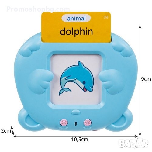 Когато детето постави карта с английска дума в устройството, играчката ще произнесе думата. Устройството има бутон за промяната на силата на звука, а бутонът за повторение улеснява научаването на новата дума. Играчката е подходяща за деца от 2 до 7 години. Цветните картинки и звук повишават интереса на децата към ученето.